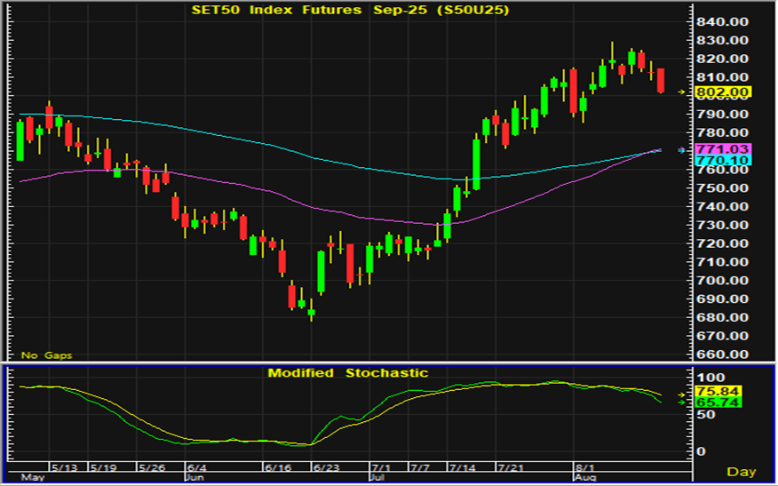 ดัชนีตลาดหุ้นไทยวานนี้ปรับตัวลงต่อเนื่องจากปลายสัปดาห์ก่อน ดัชนีดีดตัวขึ้นช่วงเปิดตลาดก่อนที่จะมีแรงขายกลับออกมาในระหว่างวันกดดันให้ดัชนีปิดตลาดปรับตัวลง หุ้นขนาดใหญ่ในหลายกลุ่มซึ่งปรับตัวเพิ่มขี้นมากในการซื้อขายช่วงหลายสัปดาห์ที่ผ่านมาต่างเริ่มอ่อนตัวลง นักลงทุนเริ่มใช้ความระมัดระวังในการลงทุนหลังดัชนีปรับตัวขึ้นมามาก ประกอบกับช่วงปลายสัปดาห์จะมีการประชุมวิชาการของธนาคารกลางสหรัฐ ซึ่งอาจมีการส่งสัญญาณการดำเนินนโยบายการเงินในอนาคต ขณะที่แนวโน้มเศรษฐกิจไทยช่วงครึ่งปีหลังซึ้งคาดว่าจะได้รับผลกระทบจากอัตราภาษีใหม่ที่สหรัฐจัดเก็บจากไทยเพิ่มขึ้น เป็นอีกปัจจัยหนึ่งที่กดดันการลงทุน ส่งผลให้การเคลื่อนไหวของตลาดหุ้นไทยในระยะสั้นมีแนวโน้มปรับฐาน การเก็งกำไรในสัญญาเดือน U แนะนำรอเปิดสถานะซื้อใกล้แนวรับบริเวณ 793-794 จุด และมีจุดขายตัดขาดทุนอยู่ที่ 790 จุด โดยมีแนวต้านสำหรับเก็งกำไรฝั่งขายอยู่ที่ 811-812 จุด และมีจุดปิดสถานะตัดขาดทุนอยู่ที่ 815 จุด