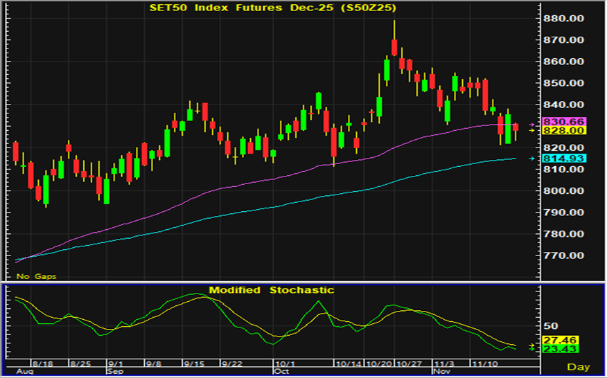ตลาดหุ้นไทยวานนี้ปิดตลาดปรับตัวลงตามทิศทางตลาดหุ้นต่างประเทศ แรงขายมีออกมาตั้งแต่ช่วงเปิดตลาด ก่อนที่จะแกว่งตัวแคบในการซื้อขายระหว่างวัน การปรับตัวลงของหุ้นกลุ่มเทคโนโลยีในตลาดหุ้นต่างประทศ รวมทั้งนักลงทุนเริ่มไม่มั่นใจว่าธนาคารกลางสหรัฐจะลดดอกเบี้ยในการประชุมครั้งหน้าเป็นประเด็นกดดันการลงทุน อย่างไรก็ตามด้วยเศรษฐกิจสหรัฐที่มีแนวโน้มชะลอตัว จึงยังมีโอกาสที่ธนาคารกลางสหรัฐจะลดดอกเบี้ยต่อไป ขณะที่ประเด็นประเทศเกี่ยวกับการกระตุ้นเศรษฐกิจและการแก้ไขปัญหาหนี้ในประเทศของรัฐบาล ยังเป็นปัจจัยบวกต่อหุ้นกลุ่มที่เกี่ยวข้อง และจะเป็นปัจจัยบวกที่ทำให้ตลาดหุ้นไทยมีกรอบการอ่อนตัวจำกัด หรือหากดัชนีปรับตัวลงคาดว่าในระหว่างวันจะมีแรงซื้อกลับเข้ามา การเก็งกำไรในสัญญาเดือน Z มีแนวรับสำหรับเปิดสถานะซื้ออยู่ที่ 822-823 จุด และมีจุดขายตัดขาดทุนอยู่ที่ 820 จุด โดยมีแนวต้านสำหรับเก็งกำไรฝั่งขายอยู่ที่บริเวณ 837-838 จุด และมีจุดปิดสถานะตัดขาดทุนอยู่ที่ 840 จุด