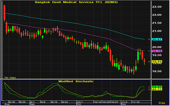 ราคาหุ้น BDMS ปรับตัวลงต่อเนื่องเป็นวันที่ 3 คาดว่าเป็นแรงขายทำกำไรที่มีกลับออกมาหลังราคาปรับตัวขึ้นมากช่วงกลางสัปดาห์ที่ผ่านมา จึงยังสามารถเปิดสถานะซื้อเก็งกำไรการดีดตัวใกล้แนวรับ18.6-18.7 บาท และมีจุดขายตัดขาดทุนอยู่ที่ 18.3 บาท