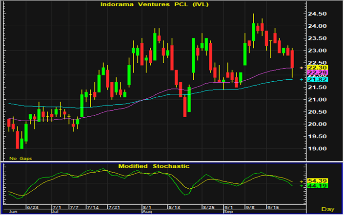 ราคาหุ้น IVL ปรับตัวลงในปริมาณมากในการซื้อขายวานนี้ และกลับลงมาเคลื่อนไหวใกล้แนวัรบบริเวณ 21.9-22 บาท ซึ่งเป็นแนวรับที่คาดว่าจะมีการดีดตัวทางเทคนิค และสามารถเปิดสถานะซื้อใกล้แนวรับดังกล่าว โดยมีจุดขายตัดขาดทนอยู่ที่ 21.5 บาท