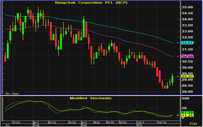 ราคาหุ้น BCP ปรับตัวลงมามาก ก่อนที่จะเริ่มมีสัญญาณซื้อเกิดขึ้นในช่วงต้นสัปดาห์ การเคลื่อนไหวทางเทคนิคในระยะสั้นกลับมามีแนวโน้มฟื้นตัว และสามารถเปิดสถานะซื้อใกล้แนวรับ 28.5-28.75 บาท โดยมีจุดขายตัดขาดทุนอยู่ที่ 28 บาท