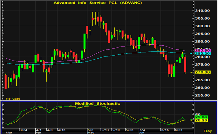 ราคาหุ้น ADVANC ปรับตัวลงในปริมาณมากในการซื้อขายวันศุกร์ และกลับลงมาเคลื่อนไหวใกล้แนวรับบริเวณ 267-268 บาท หากยังไม่ลงไปต่ำกว่าแนวรับนี้ คาดว่าจะมีการดีดตัวทางเทคนิคเกิดขึ้น และแนะนำเปิดสถานะซื้อ และมีจุดขายตัดขาดทุนอยู่ที่ 265 บาท