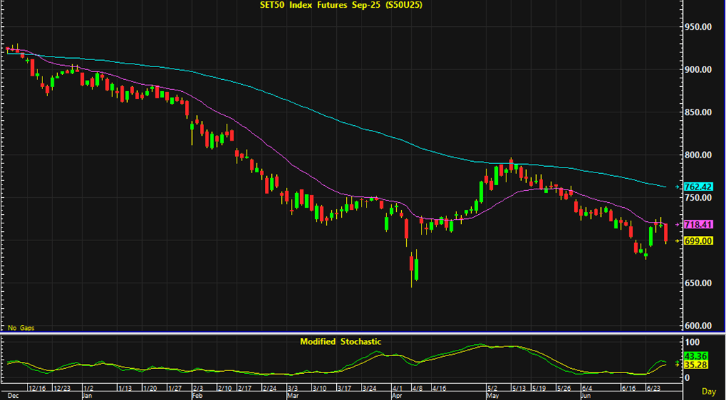 ดัชนีตลาดหุ้นไทยปรับตัวลงในปริมาณมากในการซื้อขายวันศุกร์ แต่เป็นการปิดตลาดเพิ่มขึ้นเป็นสัปดาห์แรกหลังปรับตัวลงต่อเนื่องติดต่อกัน 6 สัปดาห์ ความตึงเครียดในตะวันออกกลางที่เริ่มคลี่คลายเป็นปัจจัยบวกต่อการเคลื่อนไหวของสินทรัพย์เสี่ยง แต่ด้วยประเด็นการเมืองในประเทศ รวมทั้งความกังวลผลกระทบต่อภาคท่องเที่ยว เป็นปัจจัยกดดันการลงทุนในตลาดหุ้นไทย และในวันอังคารนี้การพิจารณาของศาลรัฐธรรมนูญซึ่งอาจส่งผลต่อการดำรงตำแหน่งของนายกรัฐมนตรีเป็นประเด็นหลักที่นักลงทุนให้ความสนใจ และคาดว่าจะส่งผลให้ตลาดหุ้นไทยในช่วงต้นสัปดาห์มีแนวโน้มอ่อนตัว ส่วนประเด็นต่างประเทศเกี่ยวกับการขยายเวลาการเก็บภาษีของรัฐบาลสหรัฐ เป็นอีกหนึ่งประเด็นที่ต้องติดตาม การเก็งกำไรในสัญญาเดือน U แนะนำเปิดสถานะซื้อใกล้แนวรับบริเวณ 691-692 จุด และมีจุดขายตัดขาดทุนอยู่ที่ 690 จุด  ส่วนแนวต้านสำหรับเปิดสถานะขายในระหว่างวันอยู่ที่บริเวณ 706-707 จุด และมีจุดปิดสถานะตัดขาดทุนอยู่ที่ 710 จุด