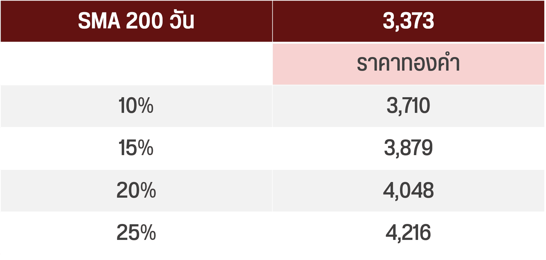 สำหรับระดับราคาทองที่มองว่าเป็นจุดน่าทยอยสะสม คือ ราคาทองคำสูงกว่า SMA 200 วัน ราว 10-15% SMA 200 วัน ณ.วันที่ 6 พ.ย. 2568 อยู่ที่ 3,373 ดอลลาร์ ดังนั้นถ้าประเมินด้วยวิธีนี้กรอบราคาทองโลกที่แนะนำทยอยสะสมคือ 3,710-3,880 ดอลลาร์ ราคาทองไทยประมาณ 58,000-59,800 บาท นอกจากนี้ปีนี้ราคาทองคำโลกยืนเหนือเส้น SMA 100 วัน จุดแนวรับที่น่าสนใจคือ 3,600 ดอลลาร์ ราคาทองไทยประมาณ 57,000 บาท