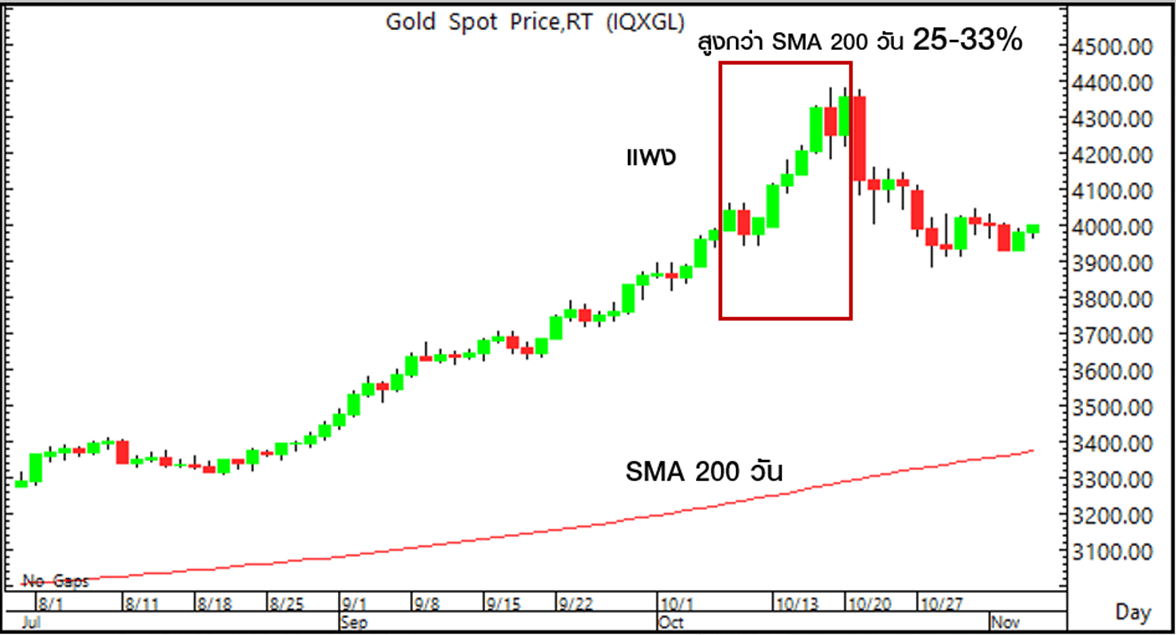 สถิติที่ผ่านมาในช่วงที่ราคาทองคำร้อนแรงมากๆ ราคาทองคำสูงกว่า SMA 200 วันราว 25% ดังนั้นเมื่อไรก็ตามที่สูงกว่าก็อาจเป็นเตือนว่าต้องระมัดระวังในการลงทุน ราคาทองแพงมากๆ แล้ว ซึ่งในช่วงวันที่ 8 ต.ค.-20 ต.ค.2568 ราคาทองคำสูงกว่า SMA 200 วันมากถึง 25-33%