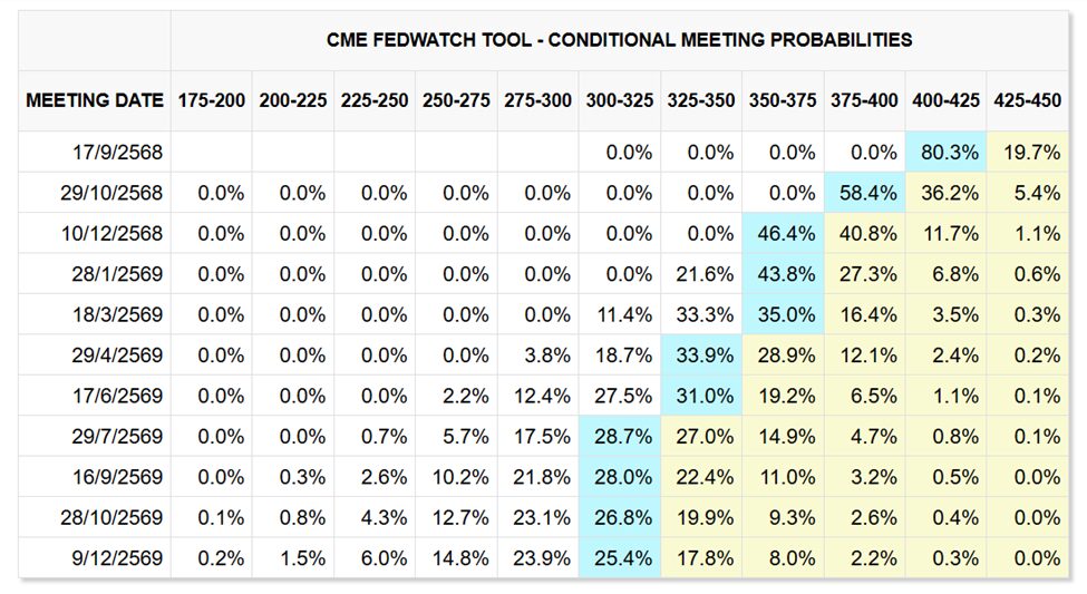 ข้อมูลเศรษฐกิจล่าสุดบ่งชี้ว่าการเติบโตทางเศรษฐกิจของสหรัฐฯ ชะลอตัวในช่วงครึ่งแรกของปี 2025 โดยขยายตัวเพียง 1.2% ลดลงจาก 2.5% ในปีที่แล้ว ซึ่งส่วนใหญ่เกิดจากการใช้จ่ายของผู้บริโภคที่อ่อนแรงลง อย่างไรก็ตาม พาวเวลยังคงมั่นใจว่าเฟดอยู่ในจุดที่สามารถรับมือกับสถานการณ์เศรษฐกิจได้อย่างเหมาะสม ขณะที่โพลสำรวจจาก CME FedWatch Tool เพิ่มคาดการณ์เฟดจะลดดอกเบี้ยในการประชุมธนาคารกลางสหรัฐฯ ที่เหลืออีก 3 ครั้งในปีนี้ โดยจะปรับลดครั้งละ 0.25% เริ่มจากเดือนกันยายน ตุลาคม และ ธันวาคม รวม 0.75% สู่ระดับ 3.50 – 3.75%
