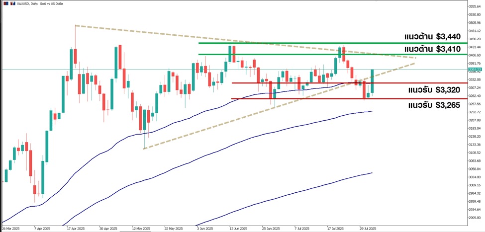 ราคาทองโลกปรับตัวขึ้นแรง กลับมายืนเหนือเส้นค่าเฉลี่ยเคลื่อนที่ EMA ทุกเส้นอีกครั้ง ขณะที่ RSI และ Stochastic Oscillators เกิดสัญญาณกลับตัวขึ้น ส่งผลให้ภาพการเคลื่อนไหวในสัปดาห์คาดมีโอกาสปรับตัวขึ้นต่อ โดยมีแนวต้านที่ 3,410 ดอลลาร์ ตามเส้นกดของ Symmetrical Triangle และถัดไปที่บริเวณจุดสูงสุดเดิมที่ 3,440 ดอลลาร์ ขณะที่แนวรับที่ 3,320 และ 3,265 ดอลลาร์