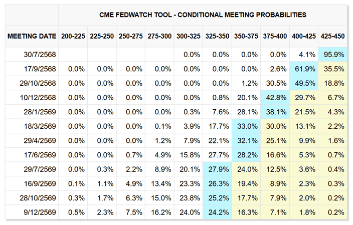 การประชุมธนาคารกลางสหรัฐฯ (เฟด) ในวันที่ 30-31 กรกฎาคมนี้ โพสสำรวจจาก CME FedWatch Tool ให้น้ำหนัก 95.9% เฟดจะยังคงอัตราดอกเบี้ยที่ระดับ 4.25 – 4.50% ต่อไป และจะเริ่มปรับลดอกเบี้ย 2 ครั้ง ครั้งละ 0.25% ในเดือนกันยายน และ ธันวาคม