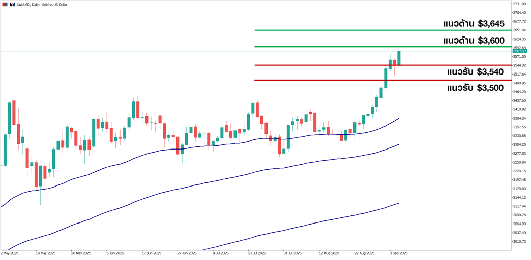 ภาพรวมความเคลื่อนไหวในสัปดาห์ยังมีโอกาสปรับตัวขึ้นต่อ และมีโอกาสทะลุแนวต้านสำคัญทางจิตวิทยาที่ระดับ 3,600 ดอลลาร์ สร้าง All-time High ได้ต่อเนื่อง ระยะสั้นแนะนำหาจังหวะเข้าซื้อสะสมเมื่อราคาปรับตัวลง คาดมีแนวรับที่ 3,550 ดอลลาร์ และถัดไปที่ 3,500 – 3,510 ดอลลาร์ ขณะที่มีแนวต้านจิตวิทยาที่ 3,600 ดอลลาร์ และหากสามารถทะลุขึ้นไปได้จะมีแนวต้านถัดไปที่ 3,645 ดอลลาร์