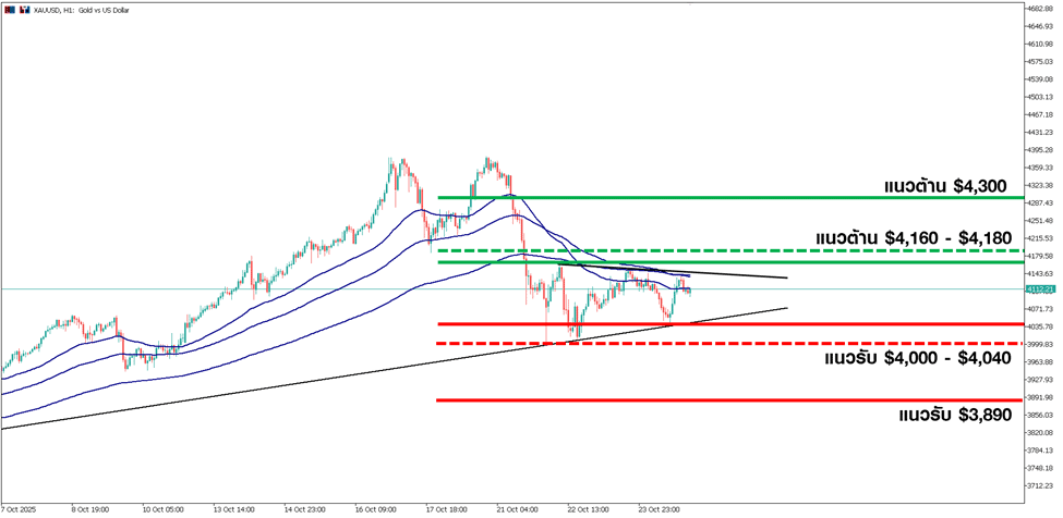 หากการเจรจามีความคืบหน้าและนำไปสู่ข้อตกลงเชิงบวก อาจกระตุ้นแรงขายทำกำไรในตลาดทองคำได้รอบใหม่ อย่างไรก็ตาม แนวโน้มหลักยังคงเป็น ขาขึ้น โดยมีแนวรับในกรอบ 4,000 – 4,040 ดอลลาร์ ซึ่งเป็นบริเวณเส้นเทรนด์ไลน์ขาขึ้นด้านล่างและแนวรับสำคัญทางจิตวิทยา หากราคาหลุดต่ำกว่าระดับนี้ มีแนวรับถัดไปที่ 3,890 ดอลลาร์ ขณะที่แนวต้านที่ 4,180 ดอลลาร์ และ 4,300 ดอลลาร์