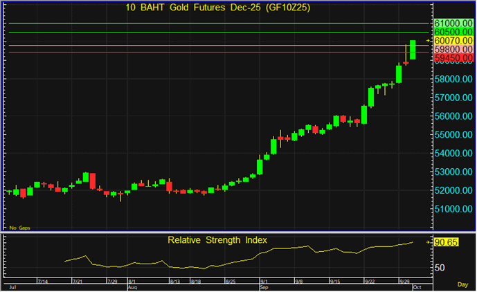 ราคา GF10Z25 กลับมาปรับตัวขึ้นได้อย่างแข็งแกร่ง จึงแนะนำไล่เปิด Long โดยมีเป้าหมายทำกำไรที่ระดับ 60,500 บาท และตัดขาดทุนหาราคาทะลุแนวรับแรกที่ระดับ 59,800 บาทลงไป