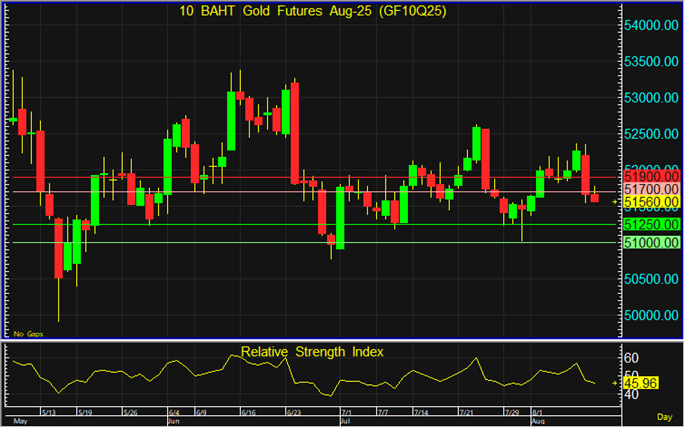 GF10Q25 อาจย่อตัวลงต่อ หลังราคาหลุดระดับ 51,700 บาทลงมา จึงแนะนำไล่เปิด Short โดยมีเป้าหมายทำกำไรที่ระดับ 51,250 บาท และตัดขาดทุนหากราคาทะลุแนวต้านแรกที่ 51,700 บาทขึ้นไป