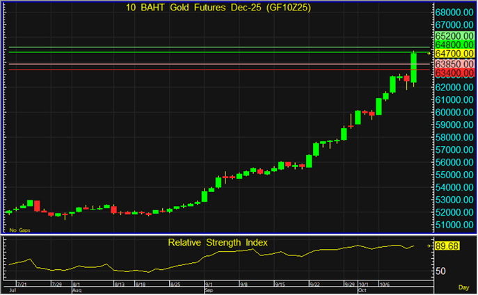 ราคา GF10Z25 เคลื่อนตัวผันผวน แต่ยังคงต้องเผชิญกับแรงขายเป็นระยะ ประเมินว่าราคาอาจยังติดแนวต้านที่ 64,800 บาท จึงแนะนำรอเปิด Short จากแนวต้านดังกล่าว โดยมีเป้าหมายทำกำไรที่ระดับ 63,850 บาท และตัดขาดทุนหากราคาทะลุแนวต้านที่ระดับ 65,200 บาทขึ้นไป