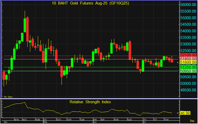 ราคา GF10Q25 ยังคงมีแนวโน้มปรับฐานลง จึงแนะนำไล่เปิด Short โดยมีเป้าหมายทำกำไรที่ 51,250 บาท และตัดขาดทุนหากราคาทะลุแนวต้านแรกที่ระดับ 51,850 บาทขึ้นไป