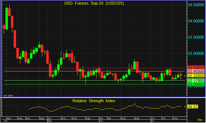 USDU25 ยังคงเคลื่อนตัวออกข้าง โดยไร้ปัจจัยที่มีนัยสำคัญเข้ากระทบ จึงประเมินว่าราคาอาจยังเคลื่อนตัวในกรอบ 32.17-32.45 บาท จึงแนะนำรอเปิด Short จากบริเวณกรอบบน และรอเปิด Long จากบริเวณกรอบล่าง