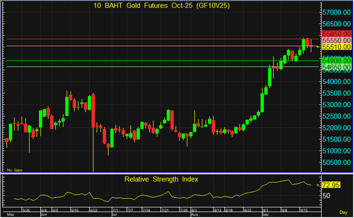 แม้ราคา GF10V25 จะเริ่มฟื้นตัวกลับขึ้นมา แต่ราคายังคงติดแนวต้านที่ระดับ 55,550 บาท จึงแนะนำรอเปิด Short จากแนวต้านดังกล่าว โดยมีเป้าหมายทำกำไรที่ระดับ 54,900 บาท และตัดขาดทุนหากราคาทะลุแนวต้านที่ระดับ 55,850 บาทขึ้นไป
