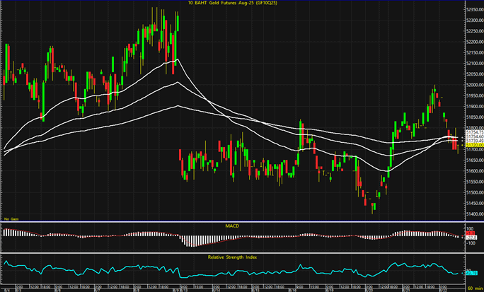 ราคา GF10Q25 ย่อตัวลงใกล้ทดสอบแนวรับที่ระดับ 51,600 บาท จึงแนะนำรอเปิด Long จากแนวรับดังกล่าว โดยมีเป้าหมายทำกำไรที่ 51,850 บาท และตัดขาดทุนหากราคาหลุดแนวรับที่ระดับ 51,450 บาทลงไป