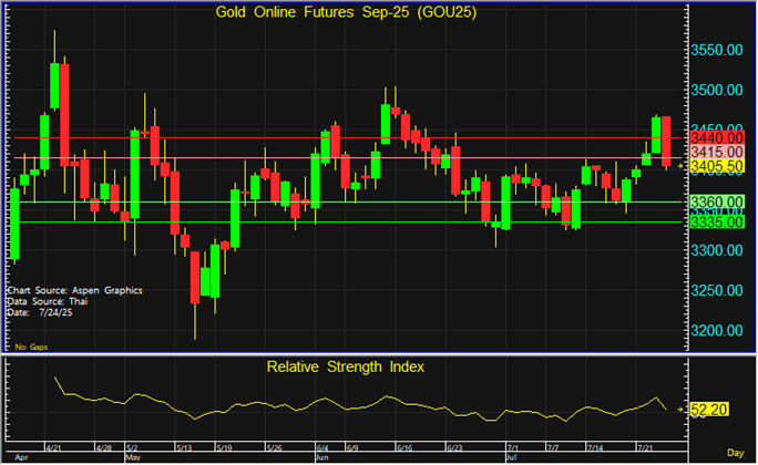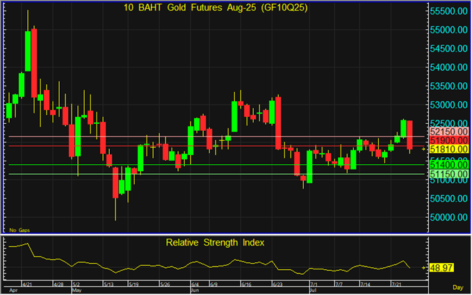 GF10Q25 ย่อตัวลงหลังมีข่าวว่าสหรัฐฯ อาจเจรจากับยุโรปในประเด็นภาษีตอบโต้ได้สำเร็จ แต่ช่วงบ่ายประเมินว่าอาจมีการฟื้นตัวสั้นๆ จึงยังแนะนำรอเปิด Short จากแนวต้านที่ระดับ 51,900 บาท โดยมีเป้าทำกำไรที่ระดับ 51,400 บาท และตัดขาดทุนหากราคาทะลุแนวต้านที่ระดับ 52,150 บาทขึ้นไป