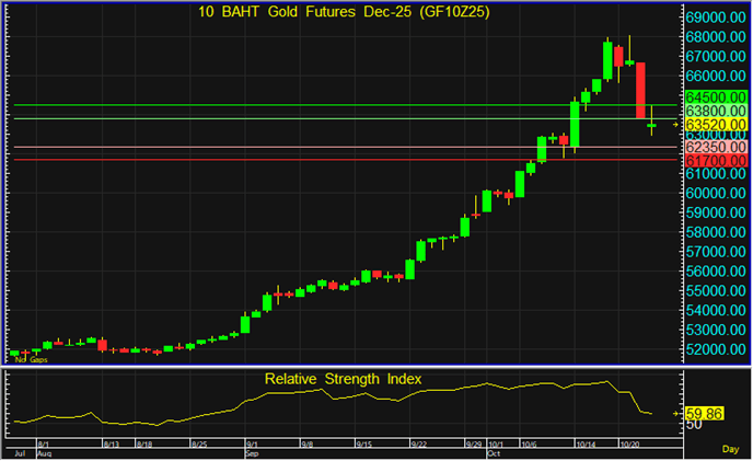 แม้ราคา GF10Z25 จะเริ่มฟื้นตัวขึ้น แต่ประเมินว่าอาจยังผ่านแนวต้านที่ระดับ 63,800 บาทขึ้นไปได้ยาก จึงแนะนำรอเปิด Short จากแนวต้านดังกล่าว โดยมีเป้าหมายทำกำไรที่ระดับ 62,350 บาท และตัดขาดทุนหากราคาทะลุแนวต้านที่ระดับ 64,500 บาทขึ้นไป