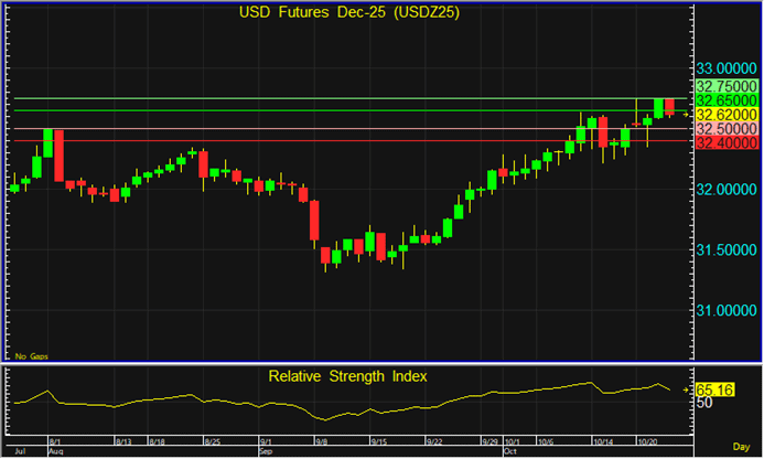 ราคา USDZ25 ย่อตัวลงมา แต่ยังแนะนำรอเปิด Short จากแนวต้านที่ระดับ 32.65 บาท โดยมีเป้าหมายทำกำไรที่ระดับ 32.50 บาท และตัดขาดทุนหากราคาทะลุแนวต้านที่ระดับ 32.75 บาทขึ้นไป