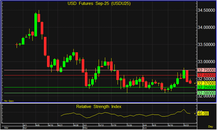 USDU25 มีแนวโน้มปรับฐานลง แต่ประเมินว่า Downside อาจเริ่มเหลือน้อยแล้ว จึงแนะนำรอเปิด Long จากแนวรับที่ระดับ 32.25 บาท โดยมีเป้าหมายทำกำไรที่ระดับ 32.60 บาท และตัดขาดทุนหากราคาทะลุแนวรับที่ 32.08 บาทลงไป