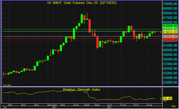 ราคา GF10Z25 กำลังทดสอบแนวต้านที่ระดับ 64,050 บาท จึงแนะนำรอเปิด Short จากแนวต้านดังกล่าว โดยมีเป้าหมายทำกำไรที่ระดับ 62,950 บาท และตัดขาดทุนหากราคาทะลุแนวต้านที่ระดับ 64,500 บาทขึ้นไป