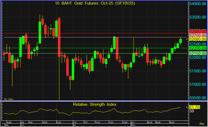 ราคา GF10V25 ที่ฟื้นตัวขึ้นมายังคงติดแนวต้านสำคัญที่ระดับ 52,750 บาท จึงแนะนำรอเปิด Short จากแนวต้านที่ระดับดังกล่าว โดยมีเป้าหมายทำกำไรที่ 52,350 บาท และตัดขาดทุนหากราคาทะลุแนวต้านที่ระดับ 52,900 บาทขึ้นไป