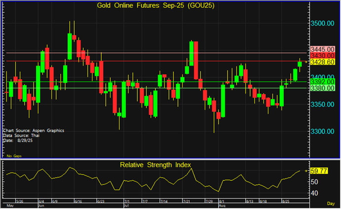 ราคา GOU25 ที่ฟื้นตัวขึ้นมายังคงติดแนวต้านสำคัญที่ระดับ 3,430 ดอลลาร์ โดยมีเป้าหมายทำกำไรที่ระดับ 3,392 ดอลลาร์ และตัดขาดทุนหากราคาทะลุแนวต้านที่ระดับ 3,445 ดอลลาร์ขึ้นไป