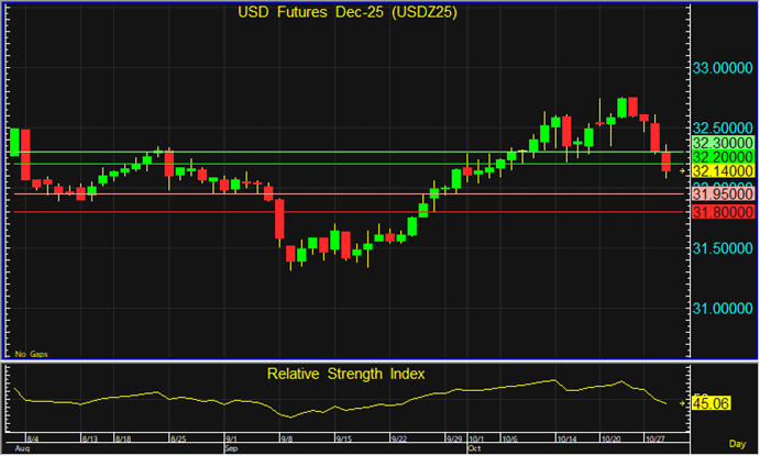 ราคา USDZ25 ยังคงมีแนวโน้มย่อตัวลง แต่กลับมาแนะนำรอเปิด Short จากแนวต้านที่ระดับ 32.20 บาท โดยมีเป้าหมายทำกำไรที่ระดับ 31.95 บาท และตัดขาดทุนหากราคาทะลุแนวต้านที่ระดับ 32.30 บาทขึ้นไป