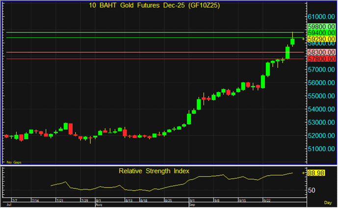 ราคา GF10Z25 เริ่มปรับฐานลงมา จึงแนะนำรอเปิด Short จากแนวต้านที่ระดับ 59,400 บาท โดยเป้าหมายทำกำไรที่ระดับ 58,300 บาท และตัดขาดทุนหาราคาทะลุแนวต้านที่ระดับ 59,800 บาทขึ้นไป
