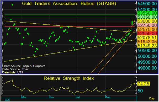 ราคาทองในประเทศอยู่ในระยะขาขึ้นตามทองโลก ขณะที่ค่าเงินบาทแข็งค่า จึงแนะนำเข้าซื้อสะสมแนวรับที่ระดับ 52,750 บาท และขายทำกำไรหากราคาทดสอบแนวต้านที่ 52,350 บาท แต่หากราคาหลุดแนวรับที่ 52,550 บาท ลงไป แนะนำขายตัดขาดทุน