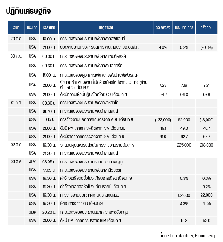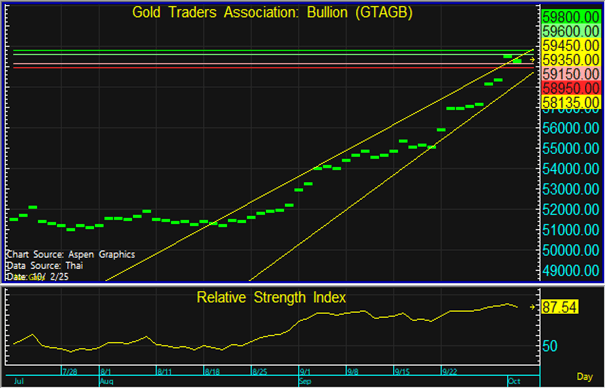 ทองโลกอยู่ในระยะขาขึ้นต่อเนื่อง จากการที่ดัชนีเงินดอลลาร์ (DXY) ได้มีการปรับฐานลงเป็นวันที่ 4 สู่ระดับ 97.63 หน่วย จากระดับสูงสุดที่ 98.49 หน่วย อีกทั้งบอนด์ยีลด์สหรัฐฯ อายุ 10 ปี ยังคงทรงตัวอยู่ในบริเวณ 4.09-4.11% สืบเนื่องมาจากวุฒิสภาสหรัฐฯ ได้ทำการลงมติต่อร่างกฎหมายงบประมาณชั่วคราวเป็นครั้งที่ 2 โดยต่อมาจากครั้งที่ 1 เมื่อวันพุธ แต่ทว่ายังไม่สามารถรวบรวมเสียงสนับสนุนมากถึง 60 เสียงตามที่กฎหมายกำหนดได้ ทำให้สหรัฐฯ ยังคงเผชิญกับภาวะชัตดาวน์ต่อไปอย่างไม่มีกำหนด อย่างไรก็ตาม บางหน่วยงานของสหรัฐฯ ยังคงเปิดให้บริการตามปกติ เนื่องจากเป็นหน่วยงานที่ไม่ได้ขึ้นตรงต่องบประมาณของสภาคองเกรส อาทิเช่น กระทรวงกลาโหม กระทรวงสาธารณสุข ประกันสังคมและ ธนาคารกลางสหรัฐฯ (เฟด) ในขณะที่ ศาลฎีกาสหรัฐฯ ได้มีคำตัดสินห้ามไม่ให้ปธน.ทรัมป์ ปลดนางลิซ่า คุก ผู้ว่าการเฟด ออกจากตำแหน่ง จนกว่าจะถึงการไต่สวนด้วยวาจาในเดือนมกราคม ปี 2569