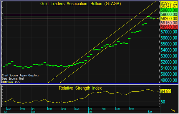 ราคาทองในประเทศพักตัวลงตามทองโลก ในขณะที่ค่าเงินบาท Sideway จึงแนะนำเข้าซื้อสะสมแนวรับที่ระดับ 59,150 บาท และขายทำกำไรหากราคาทดสอบแนวต้านที่ 59,600 บาท แต่หากราคาหลุดแนวรับที่ 58,950 บาท แนะนำขายตัดขาดทุน