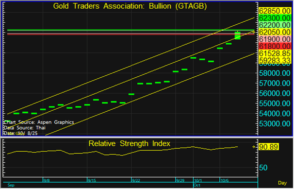 ราคาทองในประเทศอยู่ในระยะขาขึ้นตามทองโลก ในขณะที่ค่าเงินบาท Sideway จึงแนะนำขายตามแนวต้านที่ระดับ 62,200 และ 62,300 บาท และรอเข้าซื้อสะสมตามแนวรับที่ 61,900 บาท แต่หากราคาหลุดแนวรับที่ 61,800 บาท แนะนำขายตัดขาดทุน