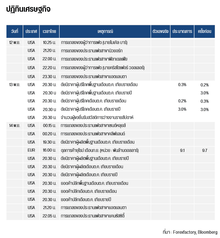 ทองโลกมีการปรับตัวขึ้น จากการที่ตลาดยังคงมีความกังวลจากผลพวงของภาวะชัตดาวน์ โดยข้าราชการและเจ้าหน้าที่รัฐกว่า 0.8-1.2 ล้านคนไม่ได้รับค่าจ้างในช่วงภาวะชัตดาวน์ ซึ่งทำให้เจ้าหน้าที่รัฐต้องเผชิญกับปัญหาทางการเงินส่วนตัวจากรายได้ที่ไม่แน่นอน อีกทั้งการจ่ายเงินเดือนย้อนหลังในแต่ละหน่วยงานต่างๆ อาจมีความล่าช้าไปจนถึงวันที่ 19 พ.ย. ซึ่งอาจส่งผลกระทบต่อการจับจ่ายใช้สอยในช่วงเทศกาลสำคัญ อย่างไรก็ตาม ตลาด CME FedWatch ได้ปรับคาดการณ์ลงสู่ระดับ 60.1% จาก 66.9% ว่าเฟดอาจลดดอกเบี้ย 0.25% ในเดือน ธ.ค.นี้ จากการที่ประธานเฟดสาขาบอสตันได้กล่าวถึงความเหมาะสมที่เฟดควรตรึงดอกเบี้ยเอาไว้อีกระยะหนึ่ง เพื่อสร้างสมดุลระหว่างความเสี่ยงด้านเงินเฟ้อและการจ้างงาน ในขณะที่ สภาผู้แทนราษฎรสหรัฐฯ ได้ลงมติจบลงด้วยคะแนนเสียง 222 ต่อ 209 เสียง และปธน.ทรัมป์ได้ลงนามกฎหมายงบประมาณดังกล่าว ซึ่งเป็นอันปิดฉากภาวะชัตดาวน์ที่ยืดเยื้อมานานกว่า 43 วัน อย่างสมบูรณ์