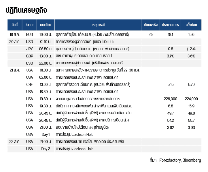 แข็งค่า หลังจากนายทาโร โคโนะ สมาชิกรัฐสภาอาวุโสจากพรรครัฐบาลกล่าวว่า แบงก์ชาติญี่ปุ่น (BOJ) ควรขึ้นดอกเบี้ยเพื่อสกัดเงินเฟ้อและในปัจจุบัน BOJ ยังตอบสนองต่อเหตุการณ์ช้าเกินไป ในขณะที่เงินยูโรได้แข็งค่าเช่นกัน จากการที่ราคาแก๊สธรรมชาติยุโรปปรับตัวลงต่ำสุดในรอบ 2 เดือน เนื่องจากตลาดได้คาดหวังว่า การที่ปธน.สหรัฐ ได้เชิญผู้นำประเทศยูเครน / อิตาลี / ฝรั่งเศส / อังกฤษ และ เยอรมนี เข้าสู่ห้องทำเนียบขาวเพื่อเจรจาหารือประเด็นสงครามรัสเซีย-ยูเครน หลังจากที่ทรัมป์ได้เจรจากับปูตินที่อะแลสกา จะช่วยให้รัสเซียสามารถกลับมาส่งออกน้ำมันดิบ / แก๊สธรรมชาติในราคาถูกหลังจากที่ถูกยุโรปคว่ำบาตร ซึ่งมีผลทำให้เศรษฐกิจยุโรปอาจกลับมาแข็งแกร่งอีกครั้ง อย่างไรก็ตาม บอนด์ยีลด์สหรัฐฯ อายุ 10 ปี ได้ปรับตัวขึ้นเป็นวันที่ 4 จากระดับต่ำสุดที่ 4.20% เป็น 4.34% ส่งผลให้ตลาดอาจให้ความสนใจในบอนด์ยีลด์สหรัฐฯ มากขึ้น ในฐานะสินทรัพย์ปลอดภัยที่ให้ดอกเบี้ยสูง ในขณะที่ทางฝั่งฮามาสได้ยอมรับข้อเสนอหยุดยิง 60 วัน กับอิสราเอล