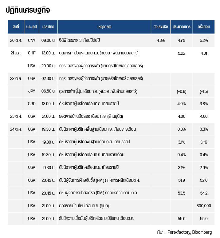 ทองโลกยังคงแกว่งตัวในกรอบแนวรับ / ต้าน จากการที่ดัชนีเงินดอลลาร์ (DXY) มีแนวโน้มทรงตัวในกรอบ 98.0 – 99.66 หน่วย อีกทั้งบอนด์ยีลด์สหรัฐฯ อายุ 10 ปี ได้ปรับตัวขึ้นสู่ระดับ 4.02% จาก 3.95% สืบเนื่องมาจากตลาดยังจับตานายสก๊อต เบสเซนต์ รมว.คลังสหรัฐฯ ที่มีกำหนดพบปะกับรองนายกฯ จีน นายเหอ หลี่เฟิง ที่ประเทศมาเลเซียในสัปดาห์นี้ เพื่อเตรียมความพร้อมก่อนการเจรจาระหว่างปธน. ทรัมป์-ปธน. สี จิ้นผิง ในช่วงวันที่ 31 ต.ค. โดยปธน.ทรัมป์ได้เน้นย้ำเมื่อวันอาทิตย์ว่า แร่ธาตุหายาก เฟนทานิล และถั่วเหลือง คือเป็นประเด็นสำคัญของสหรัฐฯ ในขณะที่สำนักงานศุลกากรจีน เปิดเผยในวันนี้ว่า ยอดนำเข้าถั่วเหลืองจากสหรัฐฯ ลดต่ำสุดในรอบ 7 ปี โดยในเดือนก.ย. ปี 2025 ได้ดิ่งลงเป็น 0 จากเดิมที่นำเข้าถึง 1.7 ล้านเมตริกตันในเดือนก.ย. ปี 2024 สวนทางกับยอดสั่งซื้อจากบราซิลที่เพิ่มขึ้นถึง 29.9% เมื่อเทียบกับปีก่อนหน้าที่ 10.96 ล้านตัน และอาร์เจนตินาที่เพิ่มสูงขึ้น 91.5% ที่ 1.17 ล้านต้น ซึ่งเป็นการสะท้อนผลกระทบจากสงครามการค้าที่ยังคงคงตึงเครียดระหว่างจีน-สหรัฐฯ และอาจเป็นประเด็นสำคัญในความขัดแย้งระหว่าง 2 มหาอำนาจในภายหลังได้