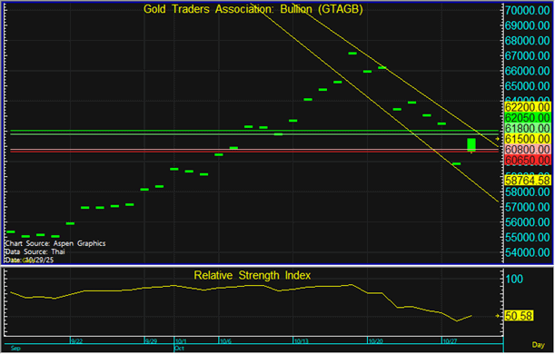 ราคาทองในประเทศมีการฟื้นตัวขึ้นตามทองโลก ในขณะที่ค่าเงินบาทแข็งค่า จึงแนะนำทยอยขายตามแนวต้านที่ระดับ 61,800 และทยอยซื้อตามแนวรับที่ 60,800 บาท แต่หากราคาหลุดแนวรับที่ 60,650 บาท ลงไป แนะนำขายตัดขาดทุน