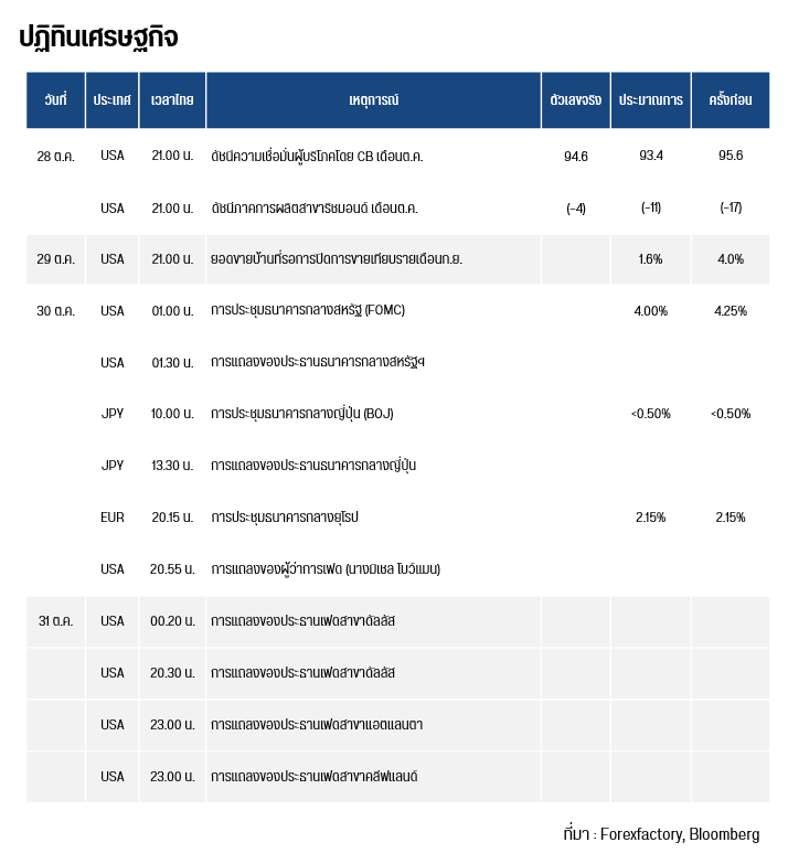 ทองโลกมีการฟื้นตัวขึ้น จากการที่ตลาด CME FedWatch Tool ได้มีการคาดการณ์ถึง 99.9% แล้วว่า เฟด อาจลดดอกเบี้ย 0.25% ในการประชุม FOMC ตี 1 คืนนี้ ในขณะที่เมื่อวันศุกร์ที่ 24 ต.ค. นักยุทธศาสตร์จากธนาคารยักษ์ใหญ่อย่าง JP Morgan ได้ออกมาคาดการณ์ว่า เฟดจะเริ่มหยุดใช้นโยบายการเงินตึงตัว (QT) ในการประชุม FOMC คืนนี้ และจะดำเนินการใช้นโยบายการเงินผ่อนคลาย (QE) ในช่วงต้นปี 2026 อย่างไรก็ตาม ดัชนีเงินดอลลาร์ (DXY) ได้มีแนวโน้มฟื้นตัวขึ้นในวันเดียวกัน สู่ระดับ 98.88 หน่วย จาก 98.62 หน่วย ในขณะที่สื่อต่างประเทศรายงานโดยอ้างแหล่งข่าวว่า บริษัท COFCO รัฐวิสาหกิจของจีนได้ซื้อถั่วเหลืองของสหรัฐฯ จำนวน 180,000 เมตริกตัน สำหรับการส่งมอบในเดือน ธ.ค. และเดือน ม.ค. ซึ่งเป็นการแสดงสัญญาณถึงความตึงเครียดทางการค้าที่ผ่อนคลายลง